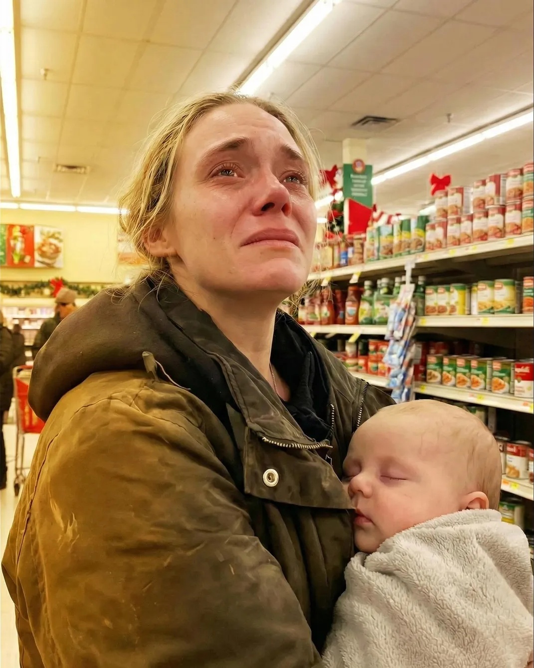 I’m Laura, forty years old, a grocery store cashier who traded childhood dreams for steady paychecks and sore feet. Late one night, ten minutes before closing, a young mother stepped into my lane with a baby asleep against her chest. Her cart held only basics—bread, eggs, milk, and one can of formula.