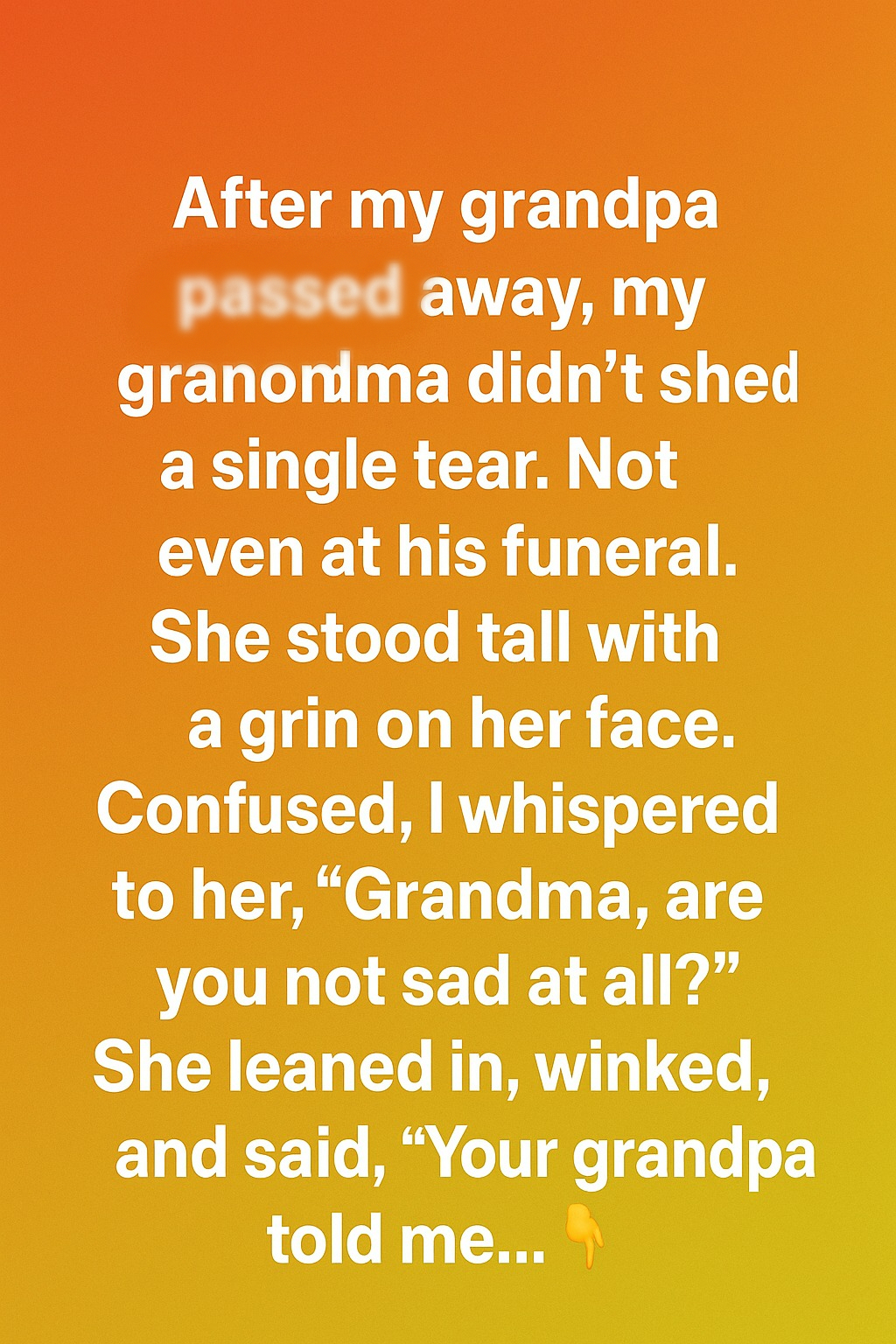Not even at his funeral. She stood tall with a calm strength and a gentle smile on her face. Confused by her reaction, I leaned over and whispered, “Grandma, are you not sad at all?” She looked at me with warmth in her eyes, leaned in, winked, and softly said, “Your grandpa told me not to cry for him, but to live for him.” Her words puzzled me at first, but I could tell there was a deeper meaning behind them.