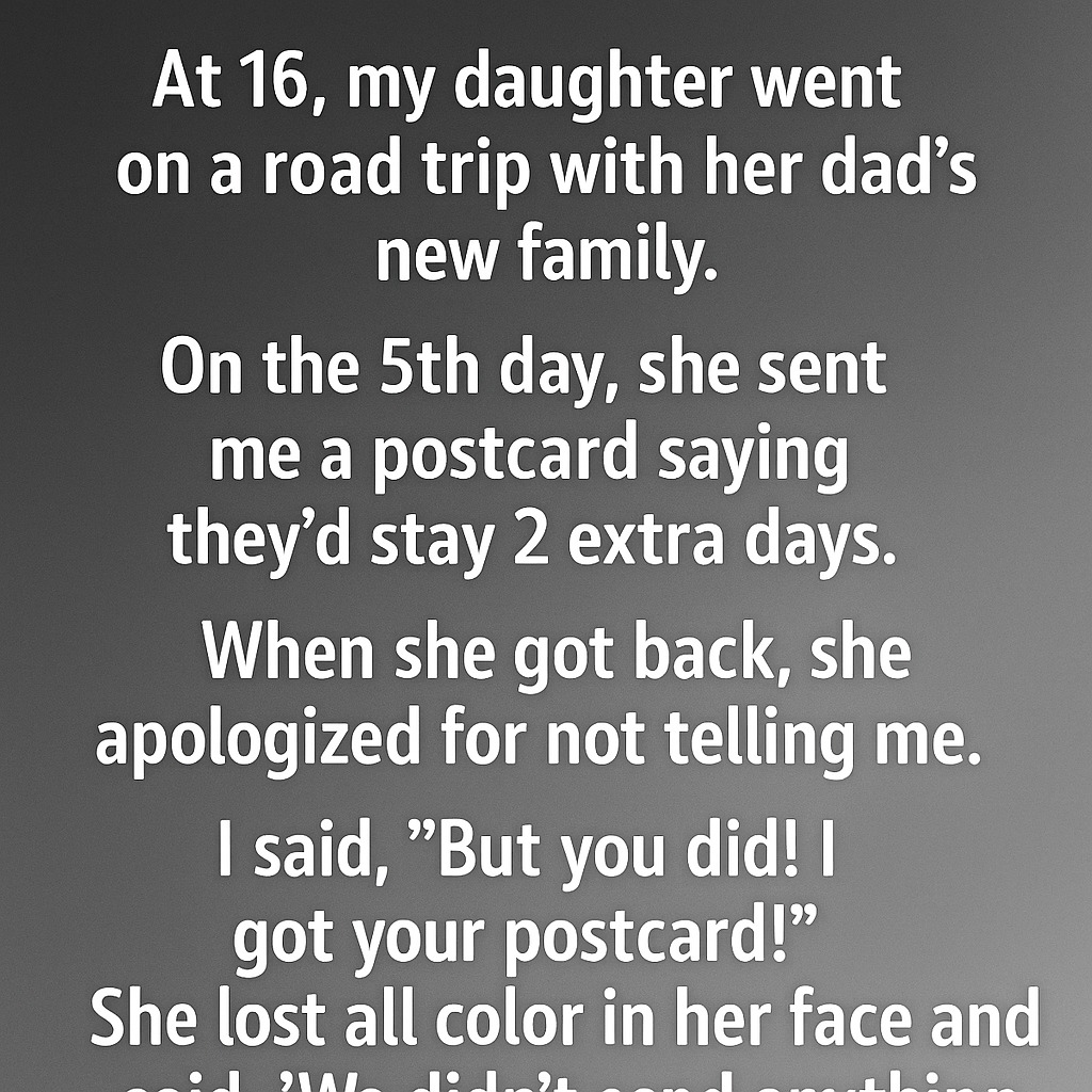 When my daughter was 16, she went on a road trip with her dad’s new family. On the fifth day, I received a postcard saying they’d be staying two extra days. When she returned, she apologized for not telling me. I smiled and said, “But you did! I got your postcard!” Instantly, the color drained from her face. “Mom… we didn’t send anything.” For a moment, we just stared at each other, caught between confusion and unease.