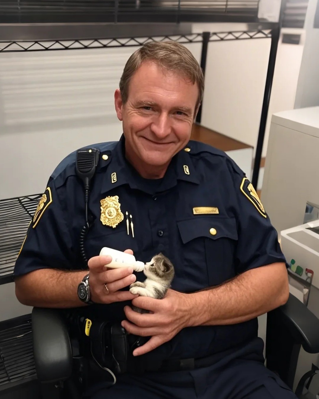 Officer Johnson expected a routine morning until faint meows pulled him outside the station. In a soggy cardboard box lay a tiny kitten, barely alive. He rushed it inside, warming and feeding it from an old bottle—yet something about the situation tugged at him.