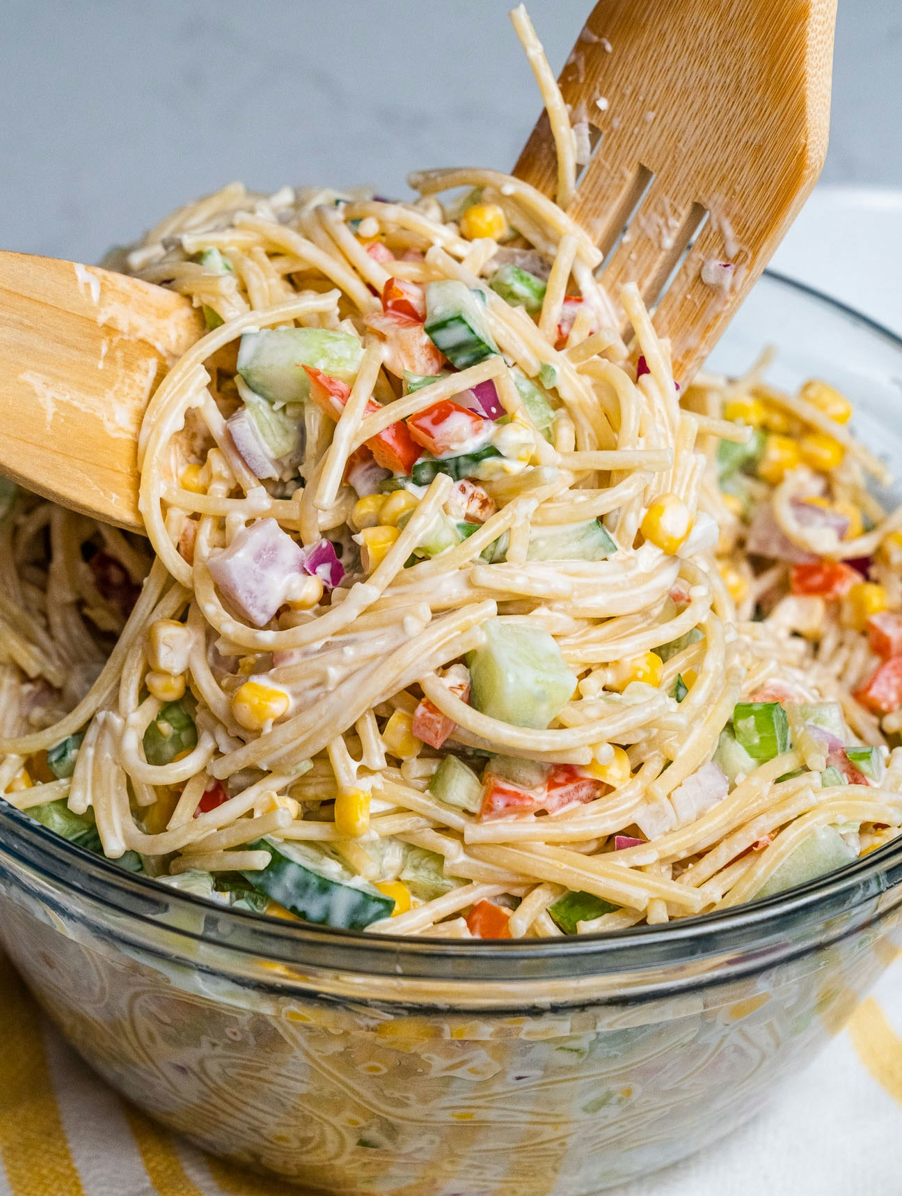 A vibrant and creamy pasta salad packed with colorful, crunchy vegetables and a tangy, savory dressing. Perfect for potlucks, picnics, or a make-ahead lunch.