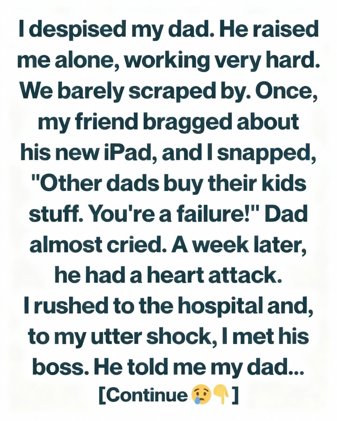 A week later, my world collapsed. My dad suffered a heart attack, and I rushed to the hospital, my cruel words replaying in my head. As I waited, a man approached me—my father’s boss. When he realized who I was, he shared things I’d never known: my dad arrived first, left last, took unwanted shifts, and turned down better-paying jobs so he wouldn’t leave me alone.