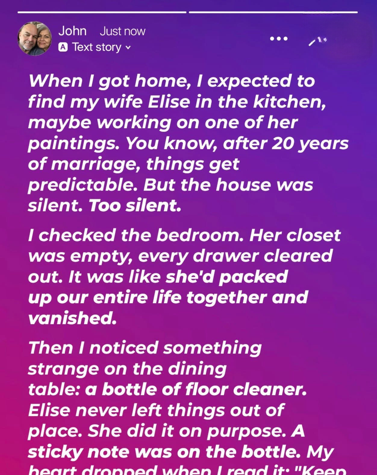 Twenty years of marriage taught me the rhythm of life—the way the coffee maker gurgles at 6:30 a.m., the soft click of the front door when I leave for work, and the gentle hum of Elise’s voice as she talks about her day when I return home.