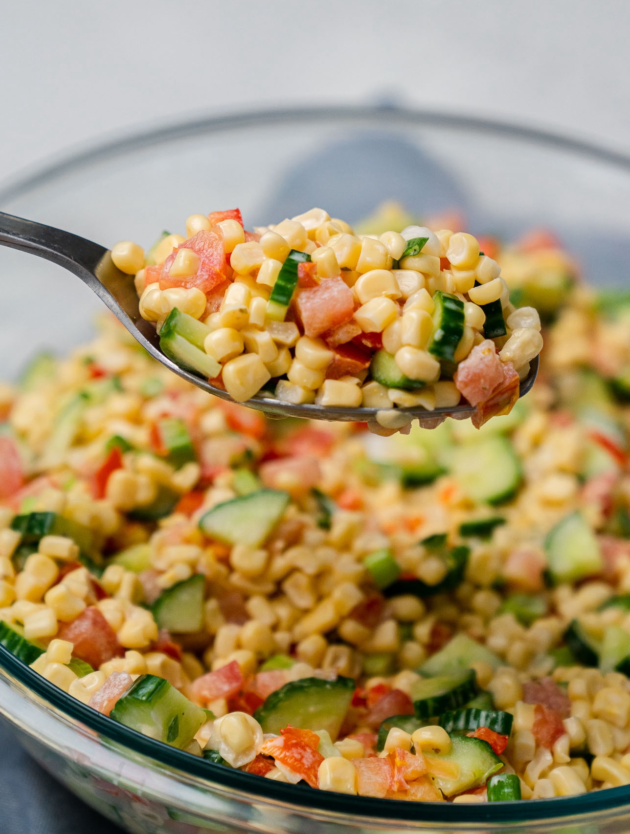 This refreshing salad is a summer staple! Sweet, crisp corn pairs perfectly with juicy tomatoes and cool cucumber in a creamy, tangy dressing. It’s the perfect make-ahead side dish for any barbecue or potluck.
