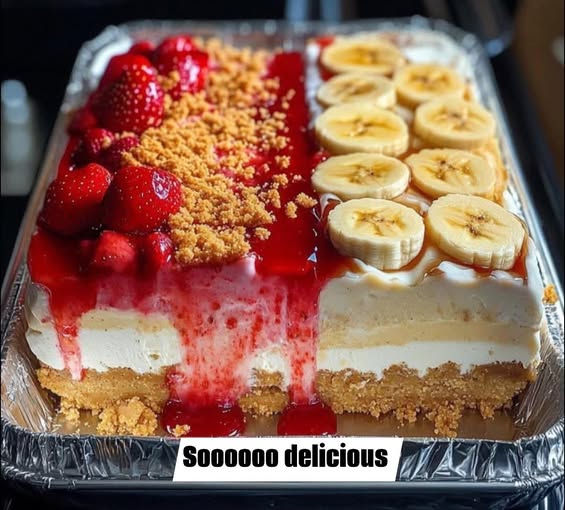 This decadent dessert combines the best of two worlds: a creamy, dreamy cheesecake base topped with a luscious Strawberry Crunch Layer and a rich Banana Pudding Layer . Perfect for parties, potlucks, or special occasions, this dessert is as beautiful as it is delicious. With fresh fruit, crunchy toppings, and silky textures, it’s sure to impress every guest!