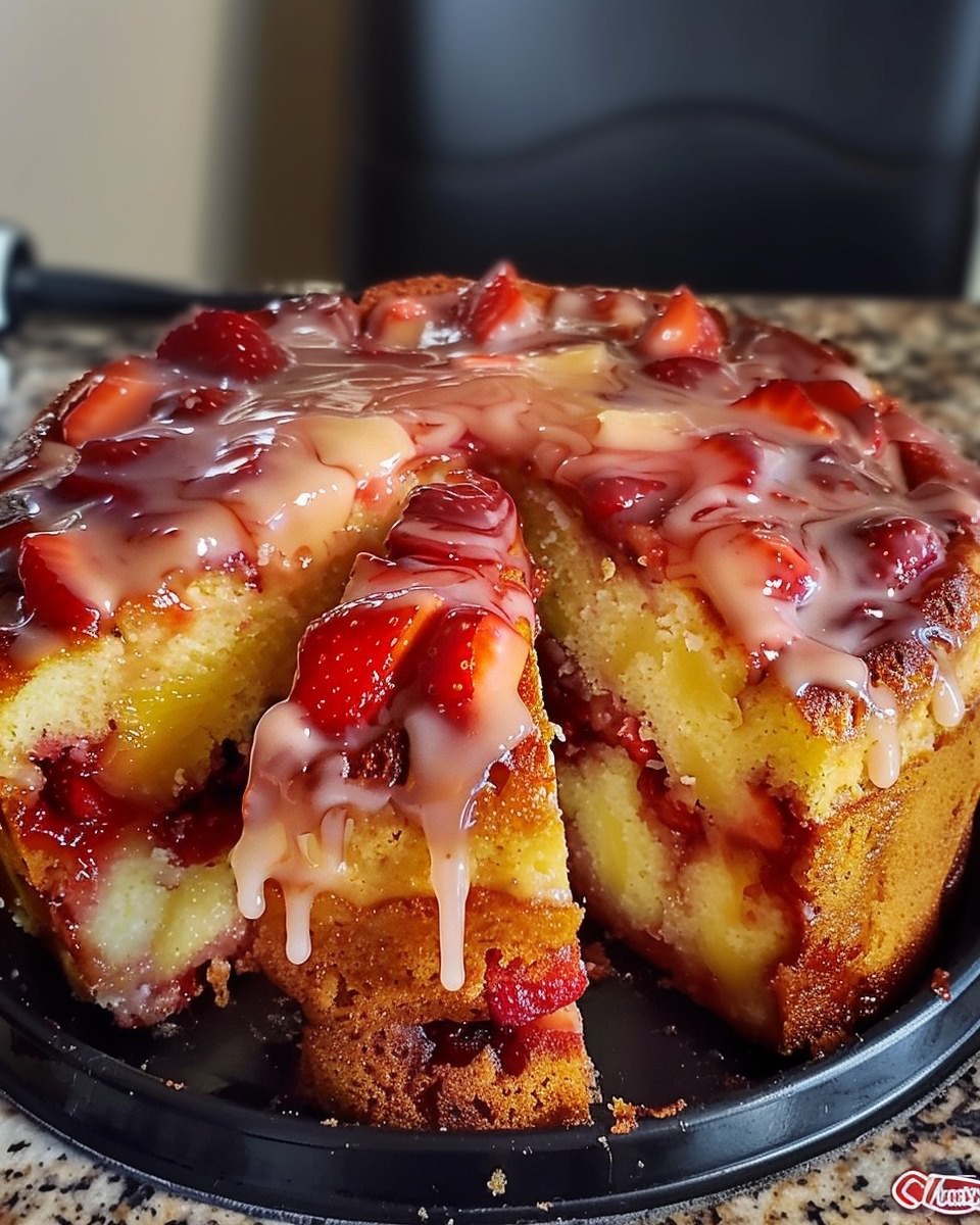 This decadent pound cake features a rich, buttery crumb swirled with layers of sweet strawberry compote and a brown sugar-kissed pineapple filling. Topped with a vibrant strawberry glaze, it’s a beautiful and delicious dessert perfect for any occasion.