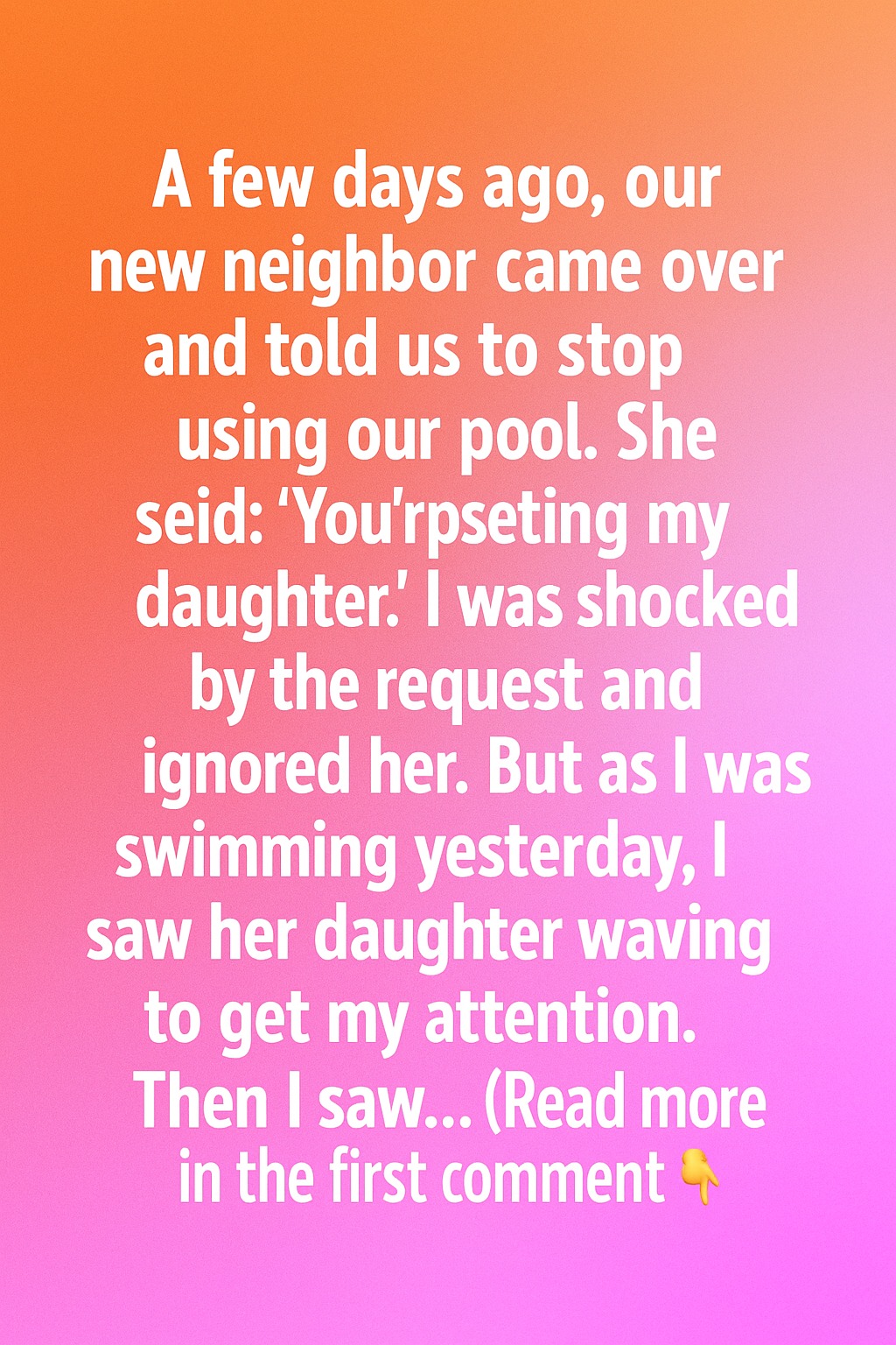 I brushed it off, assuming she was just one of those neighbors who disliked seeing others enjoy themselves. But yesterday, while I was taking a quiet swim, I noticed movement near the fence. Her little girl was standing there, waving shyly to get my attention. I waved back, thinking she just wanted to say hello — until I saw her frantically pointing toward the ground.